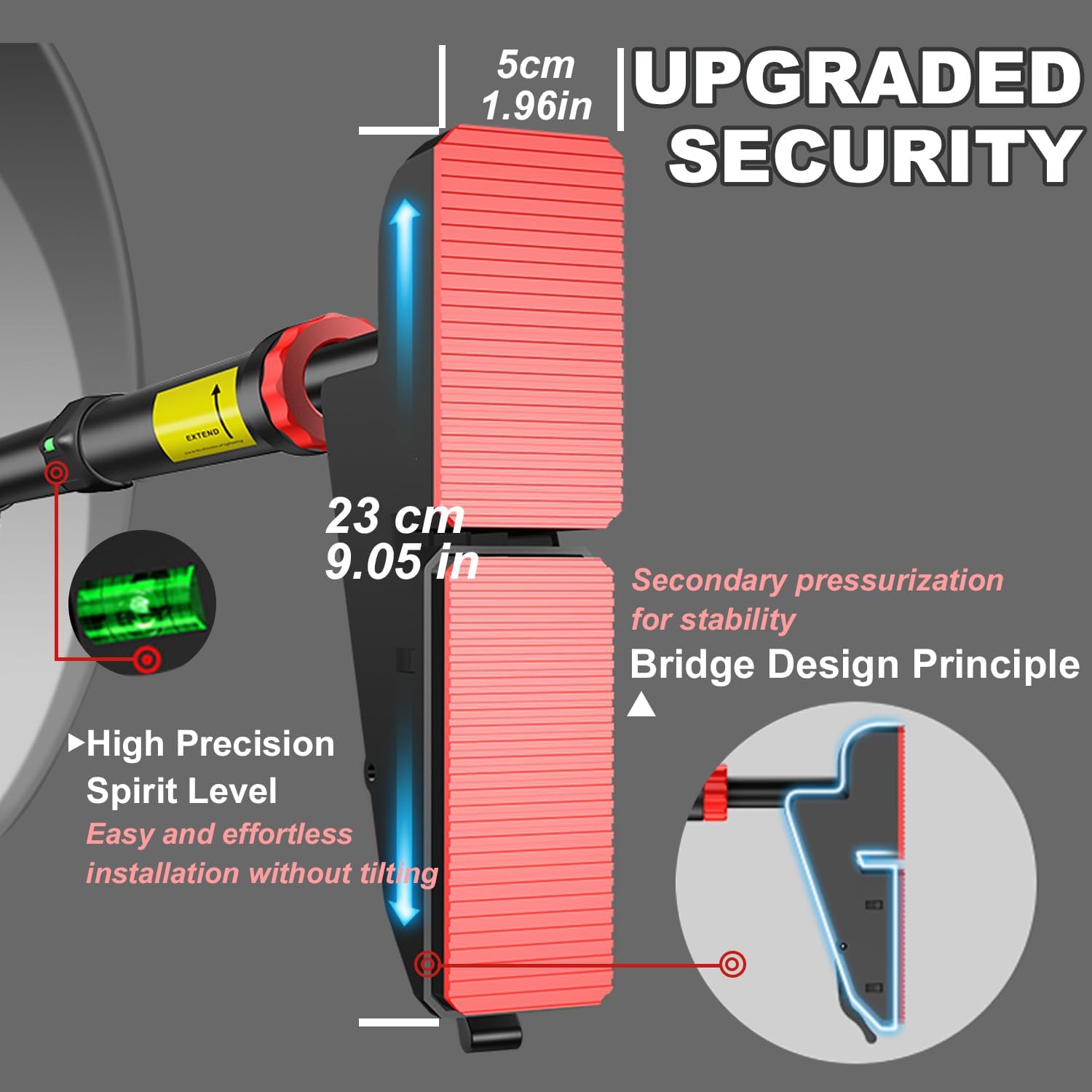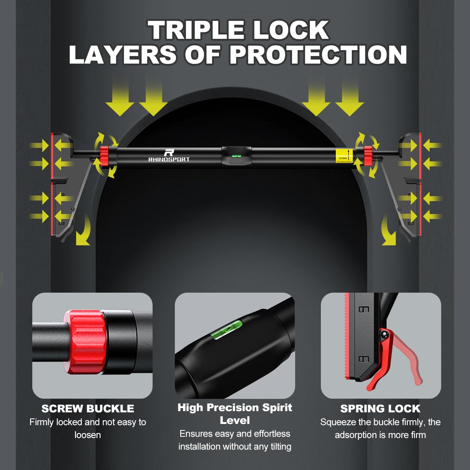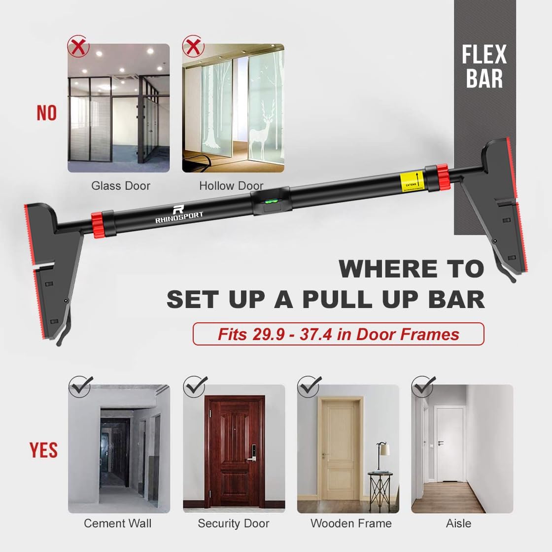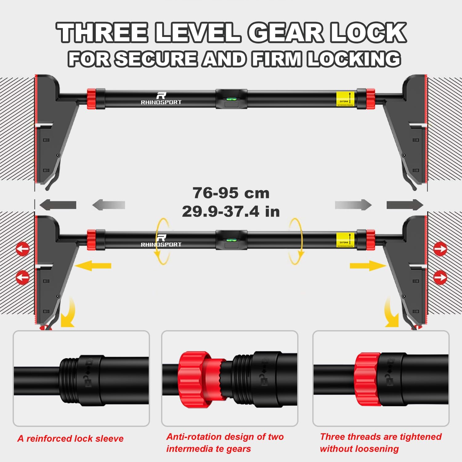 - 【Upgraded Security - Scientific Structure】The upgraded Rhinosport pull up bar adopt the bridge design principle and have secondary pressurization for stability, making us very stable. After correct installation, they can support weights of up to 880 pounds. Note: For safety, please stop extending the bars when you see the exclamation mark sign.