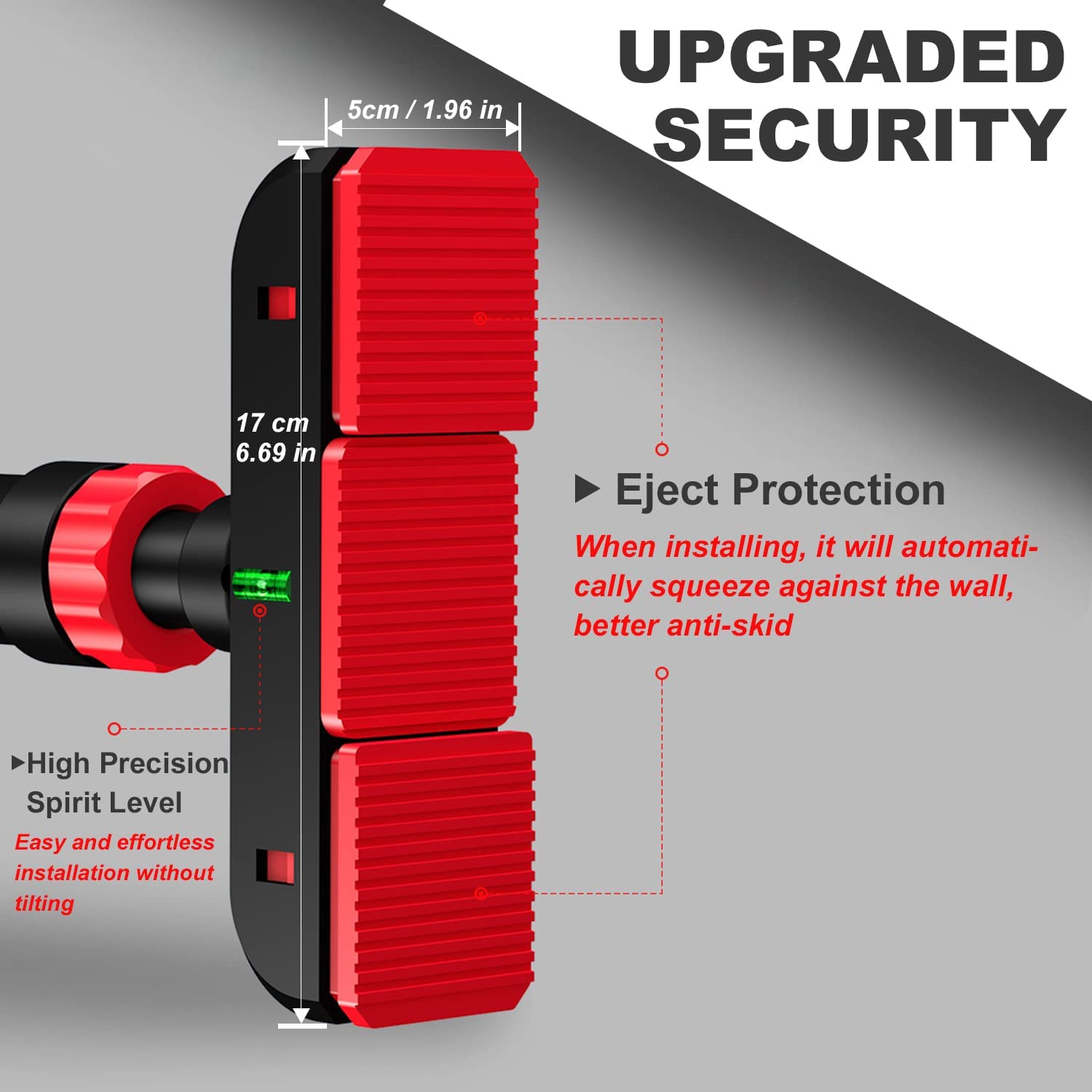 - 【Upgraded Security - Eject Protection】The two ends of this Rhinosport pull up bar are our original design of the spring automatic extrusion setting. When the gravity presses down, the upper and lower springs automatically squeeze against the wall to achieve a non-slip protection effect.