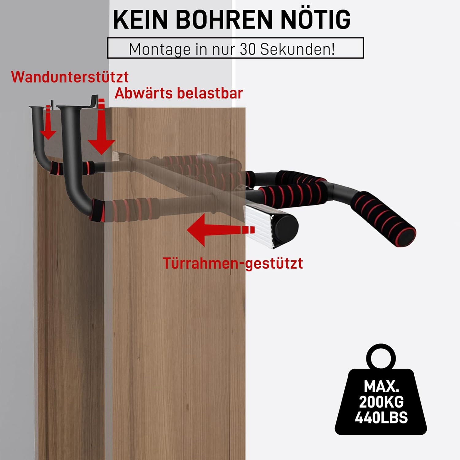 - 【PREMIUM BUILD - 200KG CAPACITY】 Heavy-gauge steel frame with dual safety bars supports up to 200kg. Thick foam padding protects doorframes while providing slip-resistant grip - perfect for intense workouts.
