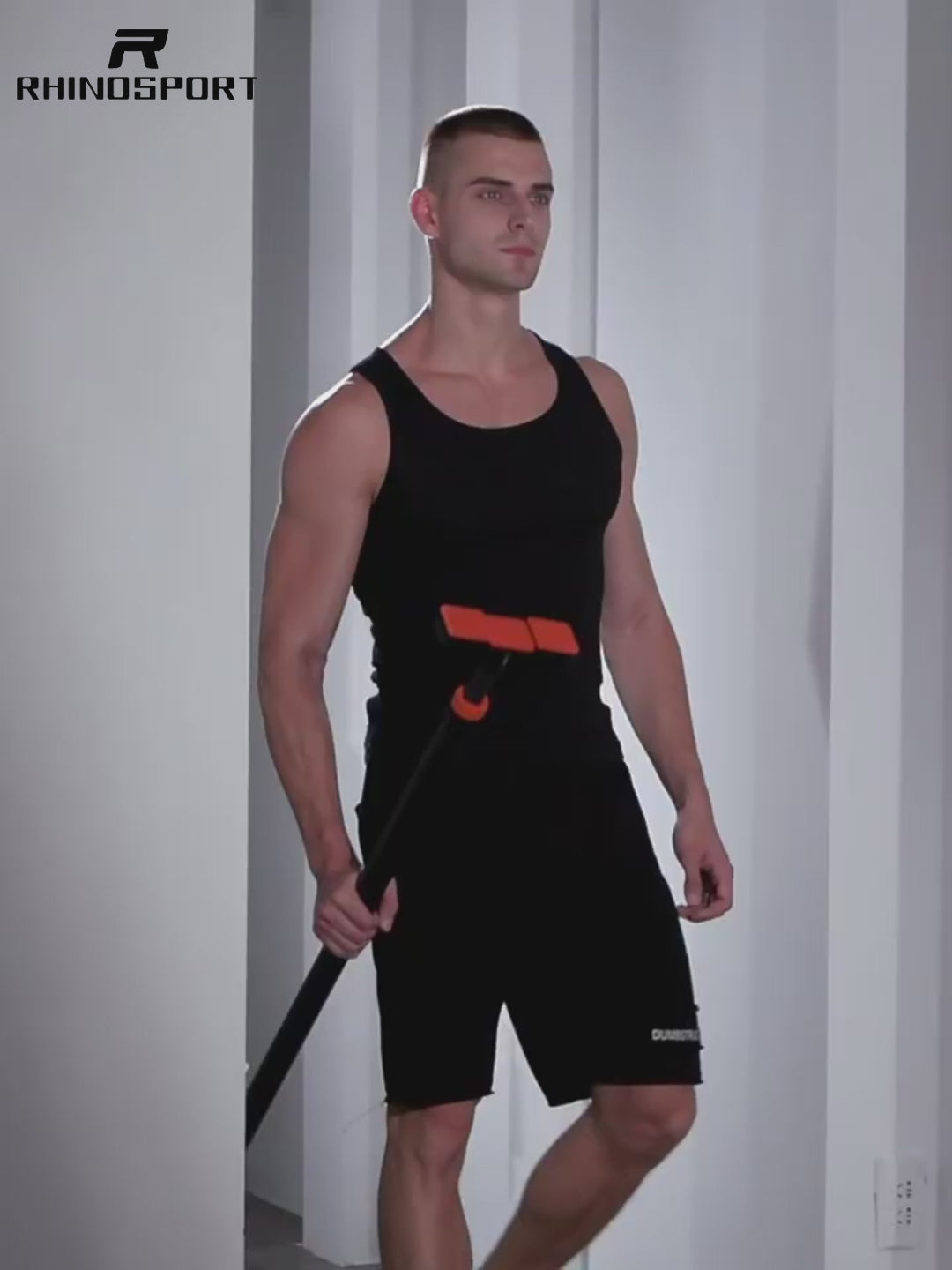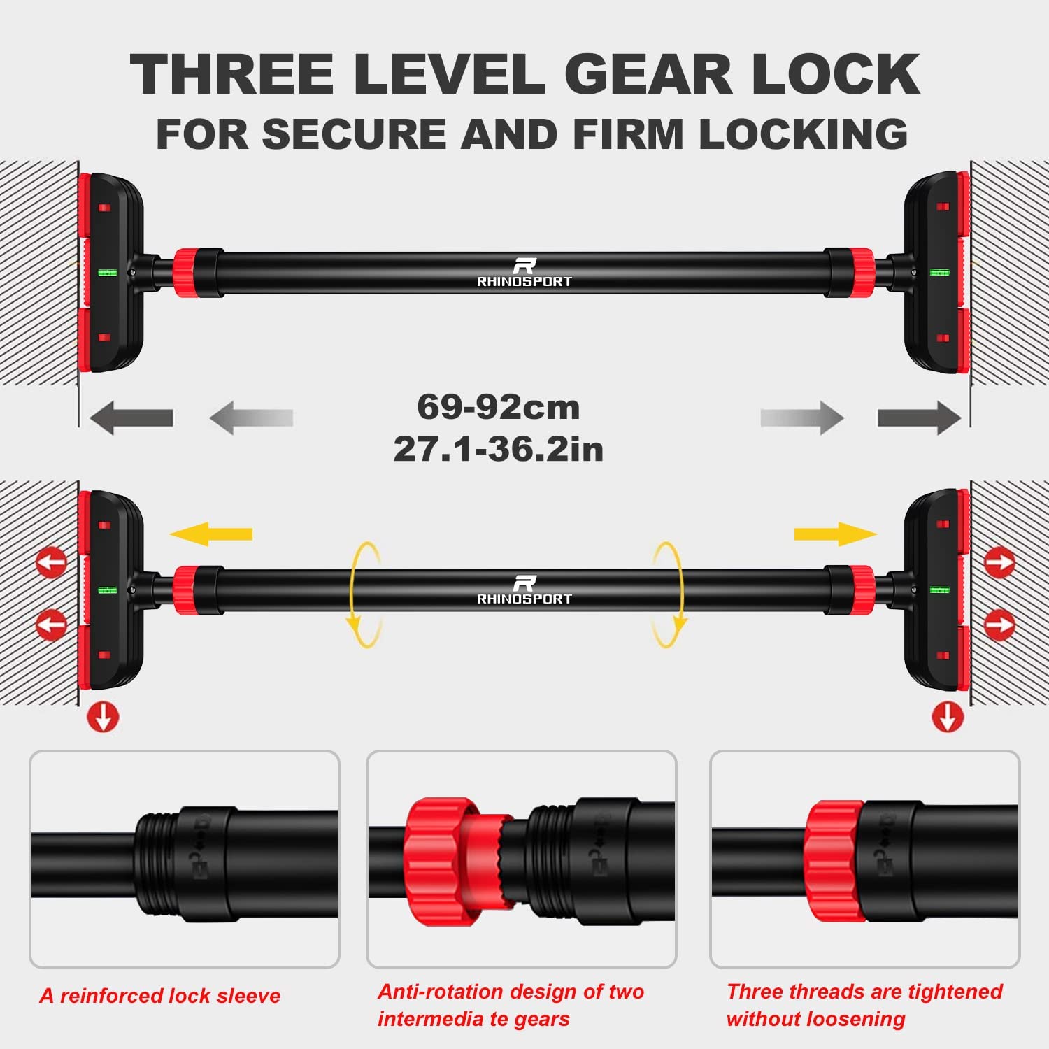 - 【Eject Protection & Triple Gear Lock Design】The two ends of this Rhinosport pull up bar are our original design of the spring automatic extrusion setting. When the gravity presses down, the upper and lower springs automatically squeeze against the wall to achieve a non-slip protection effect.