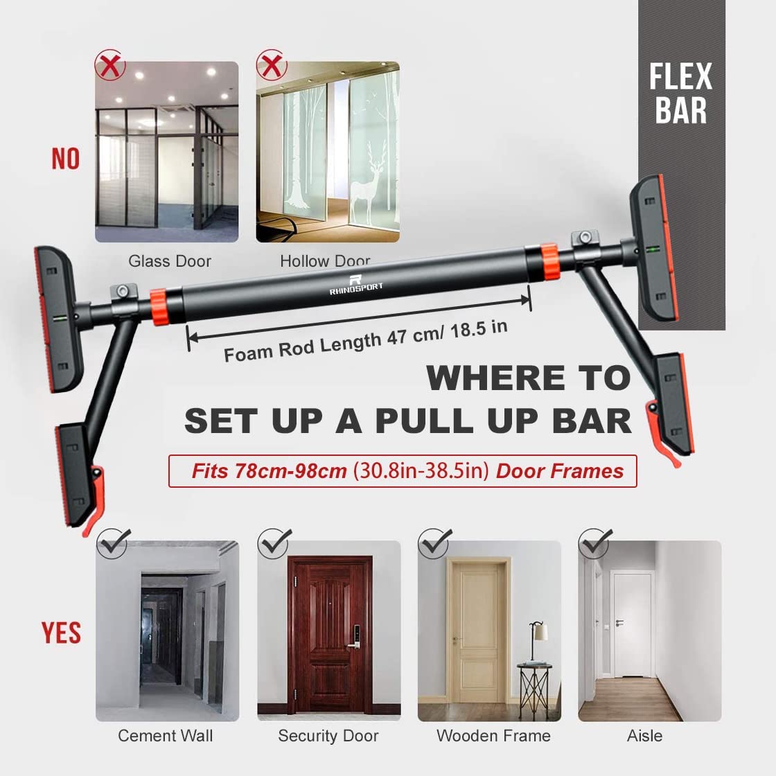 - 【Multipurpose Use And Stable】 This Rhinosport chin-up bar is perfect for chin-ups, chin-ups, sit-ups, dips, crunches, triceps dips, leg raises and more ... Make your exercises more scientific and healthier if you are not satisfied with this product , we will refund your money or replace the product with no problem. Please note that you need to measure the size of your own door frame before buying! If you have any questions, please contact us, and we will solve your problems within 24 hours.