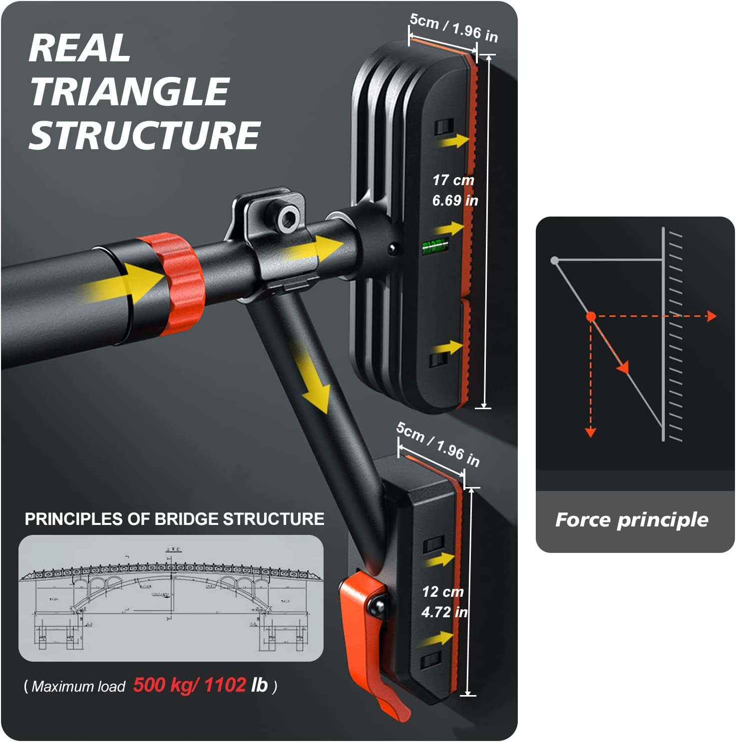 - 【Bridge structure principle】Upgraded two-way support, triangular structure, just the mechanics principle, the heavier the force on the horizontal bar, the stronger the two sides of the base, and the maximum load-bearing capacity is 500kg. (If no support rod is used, it can bear 200kg, Fit 69-92cm/27.1in-36.2in )